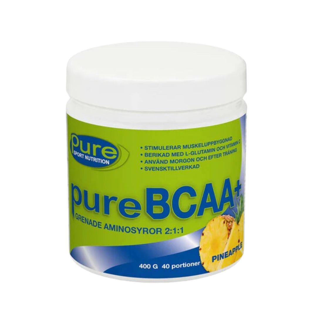 pure BCAA+ är ett kosttillskott bestående av de tre grenade aminosyrorna L-Leucin, L-Isoleucin och L-Valin. BCAA ingår i protein och har till uppgift att bromsa nedbrytningen av musklerna och istället påbörja en uppbyggande fas.