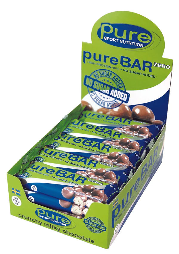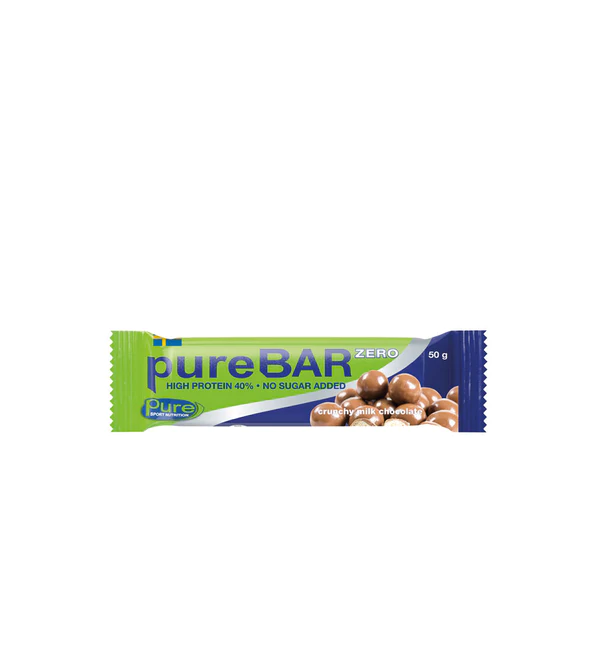 pureBAR ZERO Protein Bar en bars på 50 gram i flera smaker. Under 0,5 gram socker per bar. innehåller min. 40% protein från mjölk och hydrolysater. Proteinkällor bidrar effektivt till återhämtning samt bidrar till kroppens förmåga att bygga muskler. pureBAR ZERO innehåller sockerfri äkta mörk choklad och har även som överdrag sockerfri äkta choklad som är helt fri från palmkärneolja. pureBAR ZERO kan du ta som ett smidigt mellanmål och i samband med träning.